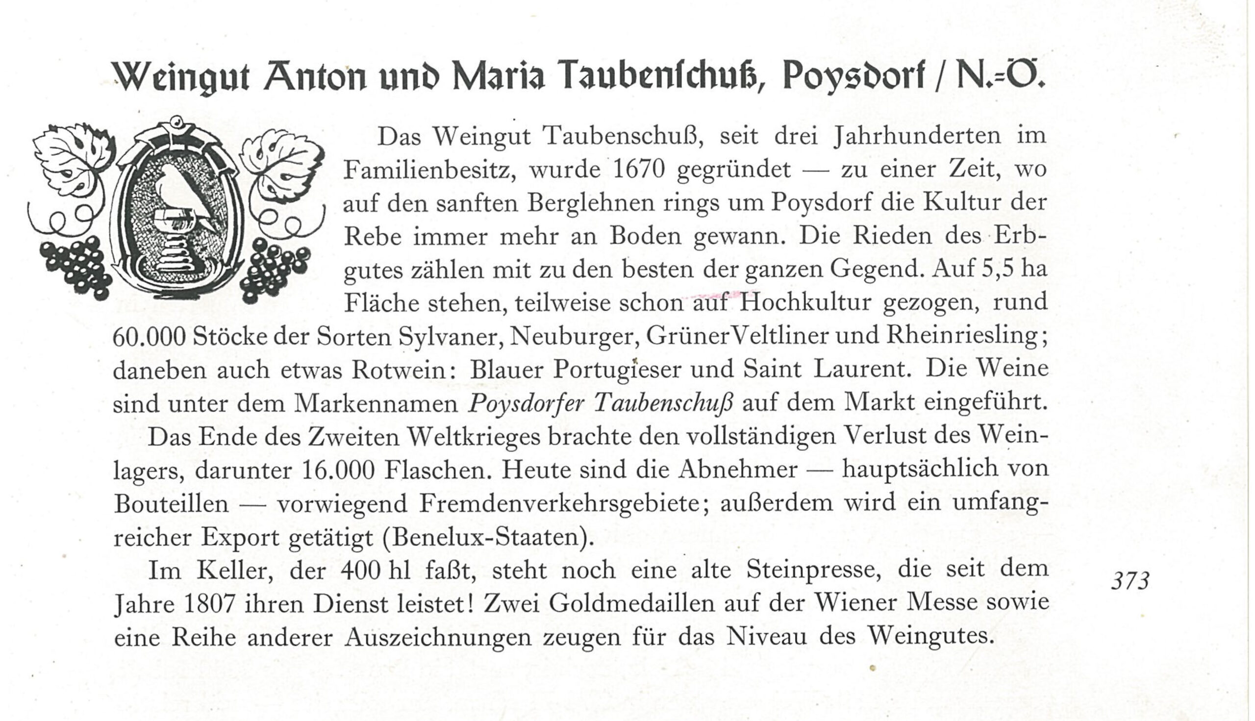 Als eines der ersten Weingüter in Österreich füllt Maria Taubenschuss (1883 – 1952) mit ihrem Sohn Anton Taubenschuss III. die hauseigenen Weine in Bouteillen (damals 0,7 Liter Flaschen) ab.